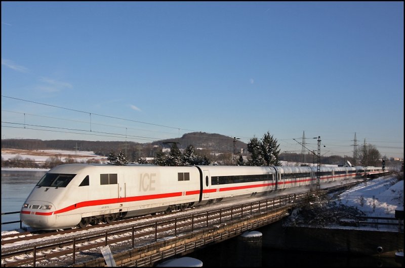 401 057 (9380 5 401 057-5 D-DB) durchfährt als ICE 1026, Regensburg Hbf - Kiel Hbf, dass verschneite Ruhrgebiet bei Wetter(Ruhr) in Richtung Norden. Hier überquert der Zug den teilweise zugefrorenen Harkortsee. (06.01.2009)
