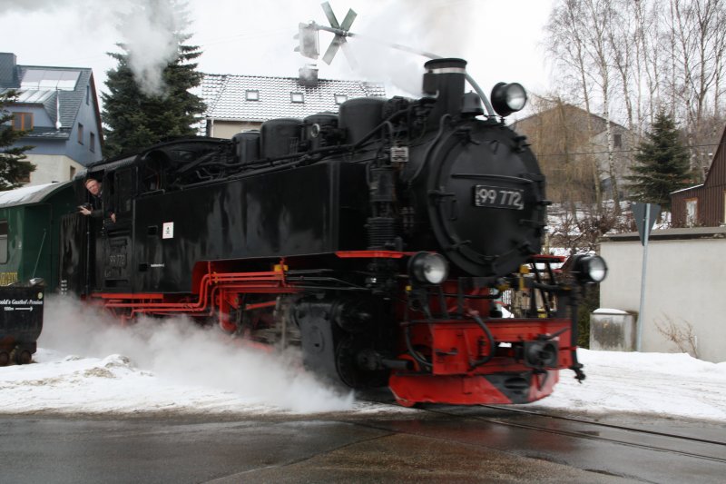 99 772 am 25.01.09 bei der Ausfahrt aus dem Bahnhof Neudorf.