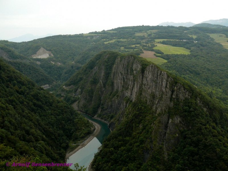 Blick hinunter ins Tal aus der SGLM, deren Trasse in die fast senkrechten Hänge der Schlucht des Flusses Drac gesprengt wurde. Hinten unten im Tal ein Blick auf die Bahn unten im Tal.