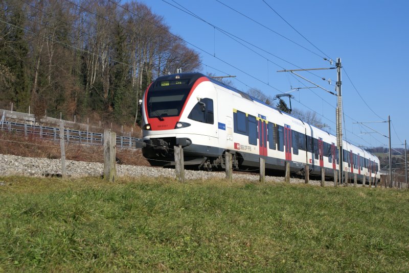 Den RABe 523 010-7, der sich als S 21 nach Zug am 25.1.09 Baar nähert, habe ich aus einer etwas tieferen Position abgelichtet.