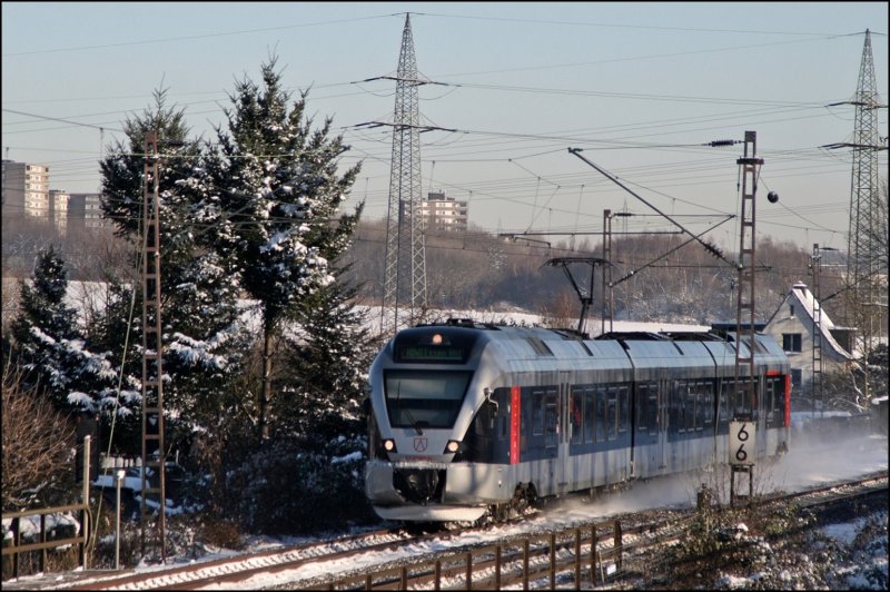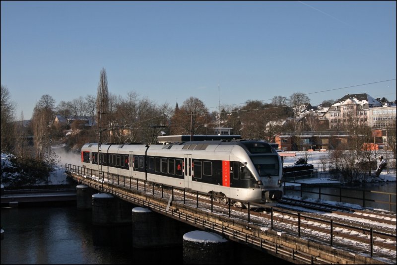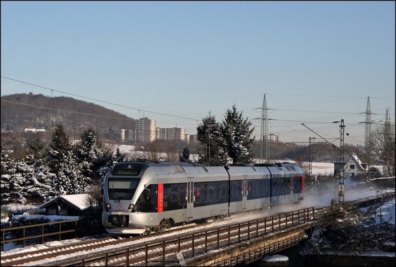 ET23009 "Kreis Siegen-Wittgenstein" ist als ABR99616 (RE16 "Ruhr-Sieg-Express") nach Siegen unterwegs. Wegen der Kälte wurden die Züge zwischen Letmathe und Essen alleine geführt....