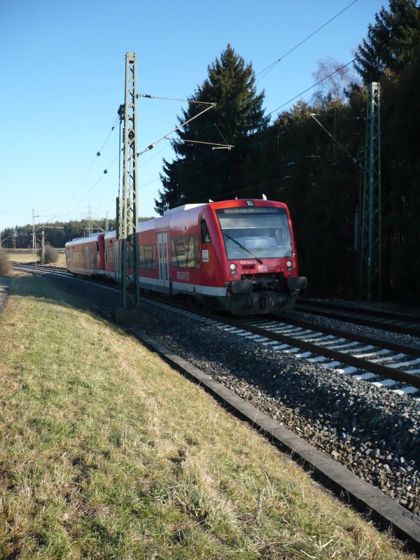 Eine NordWestBahn Lint 41 Doppeltraktion fährt am 25.1.2009 als NWB 81320 von Wilhelmshaven nach Osnabrück Hbf. Aufgenommen kurz nach der Ausfahrt aus Sandkrug.