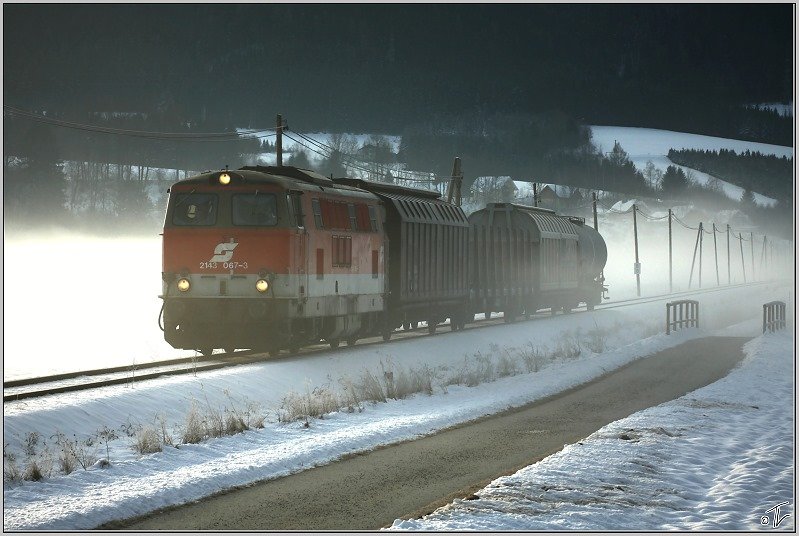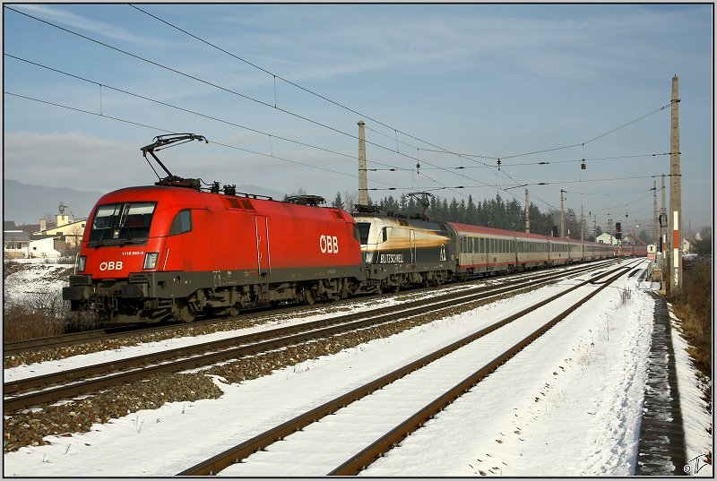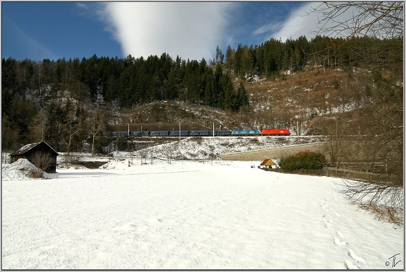 1116 265-8 ist zur frostigen, sonnigen Mittagszeit bei Marchtrenk mit einem Güterzug Richtung Linz unterwegs; 090108
