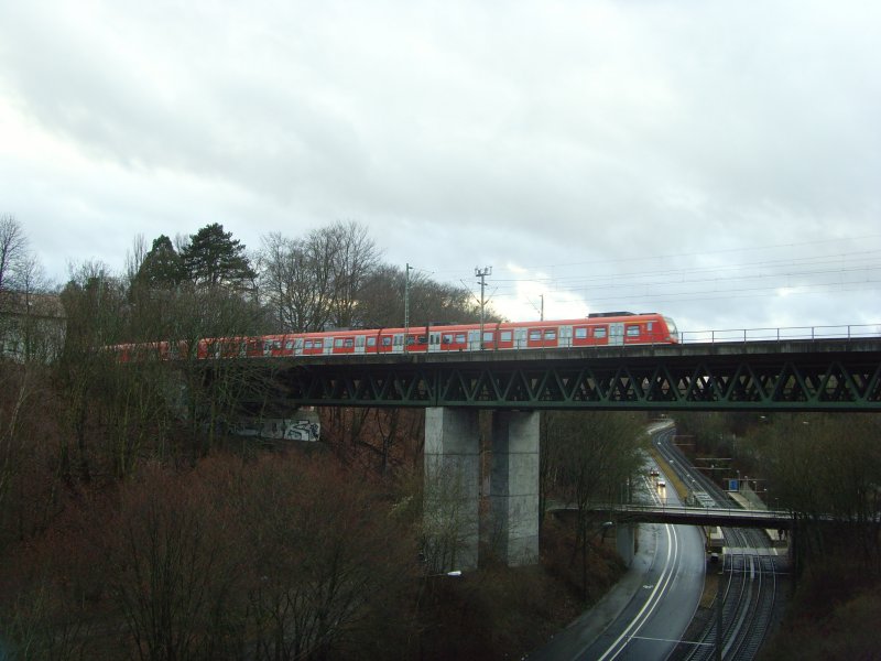 Dreifachtraktion BR 423 überquert den Nesenbachviadukt in Stuttgart-Vaihingen. Unter dem Viadukt verläuft die Strecke der U-Bahnlinie U1. 23.01.09