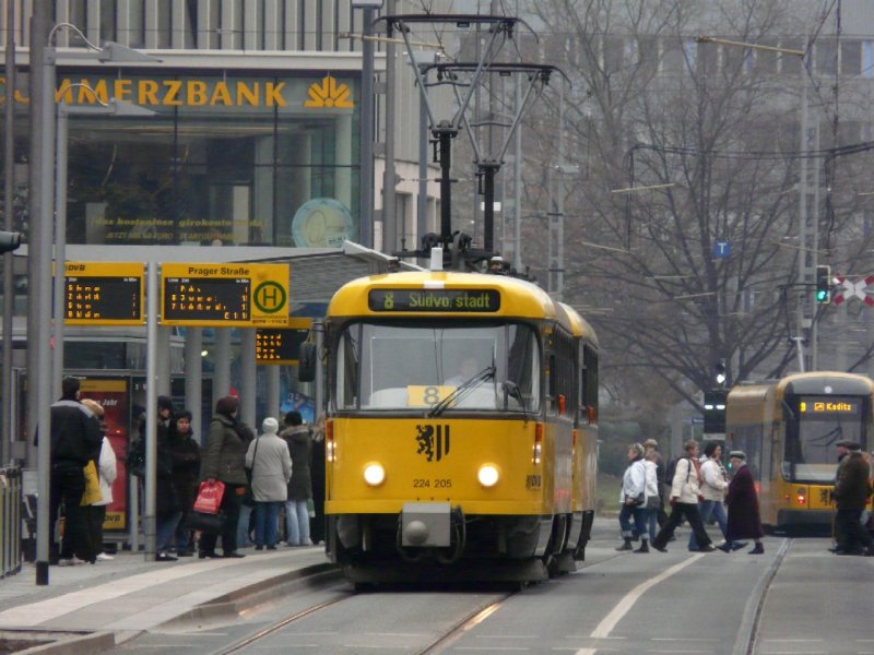 Dresden - Strassenbahn Nr.224 205 unterwegs auf der Linie 8 am 10.12.2008