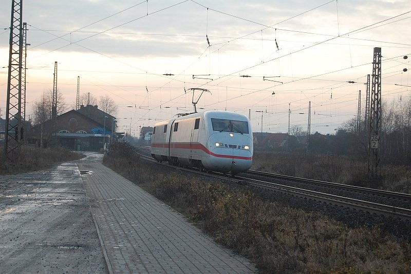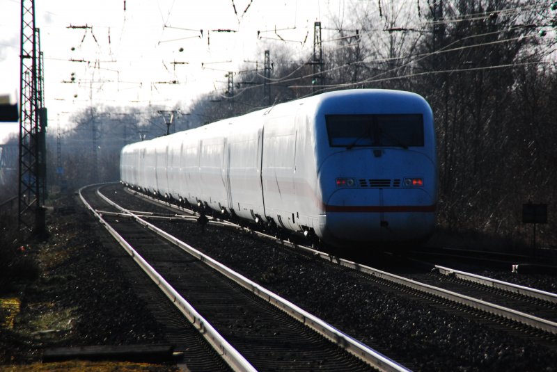 Durch die tiefstehende Sonne rollt dieser ICE2 einer ungewöhnlichen Stelle entgegen. Am linken Bildrand, noch links neben den Oberleitungsmasten mag man die stählerne Brücke von Avenwedde erkennen, zu der sich die umgeleiteten Züge von Bielefeld in Richtung Ruhrgebiet heraufkämpfen. An dieser Stelle wechseln die Personen- und Güterzugtrassen die Seiten, um sich bei Hamm endgültig zu trennen. Sonntag 25.01.2009