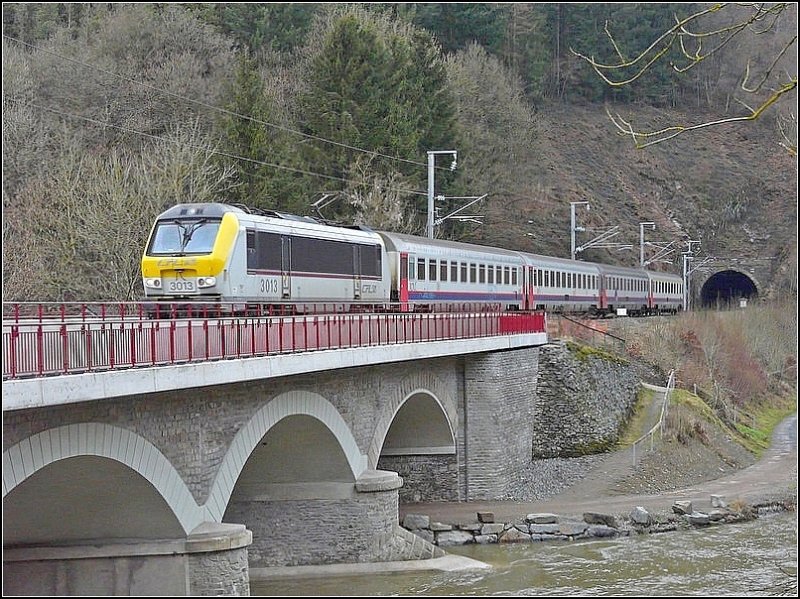 E-Lok 3013 hat am 24.01.09 mit ihrer belgischen Zuggarnitur den Tunnel vor Michelau verlassen und fährt über die runderneuerte Sauerbrücke in Richtung Luxemburg. (Jeanny)