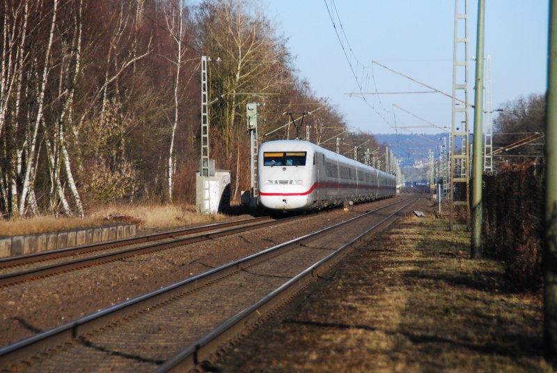 Ein ICE2 auf totalen Abwegen. Wegen Gleisbauarbeiten zwischen Bielefeld und Gütersloh müssen alle Linien von Bielefeld in Richtung Ruhrgebiet für einige Kilometer auf die sonst nur von Güterzügen genutzte Trasse ausweichen. In Bielefeld wechselt man auf die GZ-Strecke um dann hinter Gütersloh wieder seinen normalen Weg zunehmen. Ungewöhnlich deshalb, weil die beiden Strecken sich überschneiden und die Güterzügen sich erst zur einer Brücke schlängeln. Aus der Vogelperspektive mit einen ICE mag das recht interessant aussehen. Avenwedde am 25.01.2009