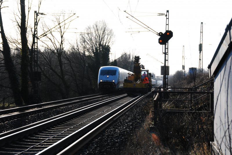 Ein recht seltener Anblick: ICE2 mit geöffnetem Kupplungsmaul meets Bahnbagger. Der ICE rollt in Richtung Bielefeld. Die Arbeiter des Gleistrupps bereiten den Austausch der Gleise vor. Am rechten Schienenstrang erkennt man die "geparkten" Ausstauschteile, die in den nächsten Tagen montiert werden. Ein Dankeschön an den Zugführer des ICE für seinen Gruß (15.47h am 25.01.2009 im Bahnhof Avenwedde). GANZ SCHÖN LAUT DEINE TRÖTE!!