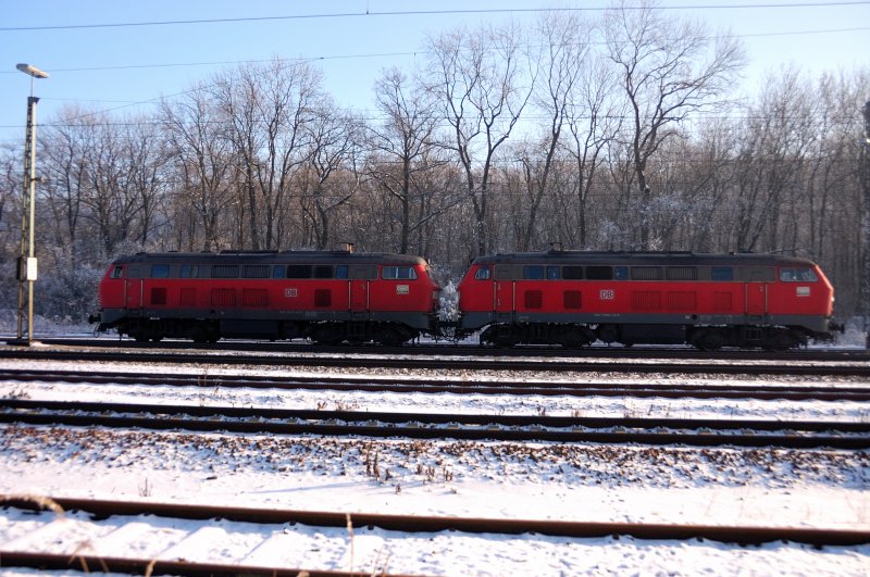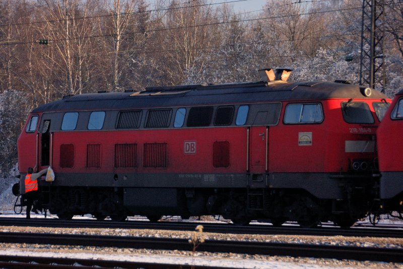Eine Doppeltraktion 218er als Lokzug unterwegs in der winterlichen Landschaft der KBS 980 Mitte Januar 2009.