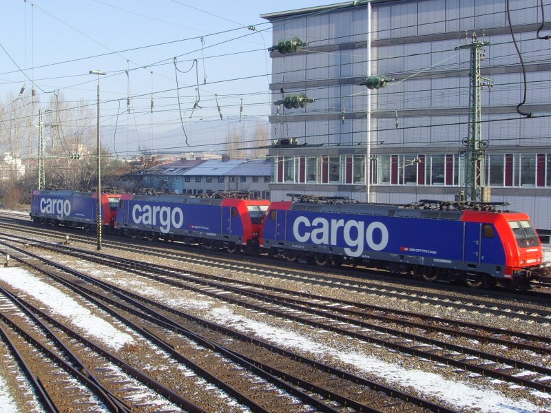 Eine Dreifachtraktion Re 482 durchquert das Gleisvorfeld des Freiburger Hauptbahnhofes. 11.01.09