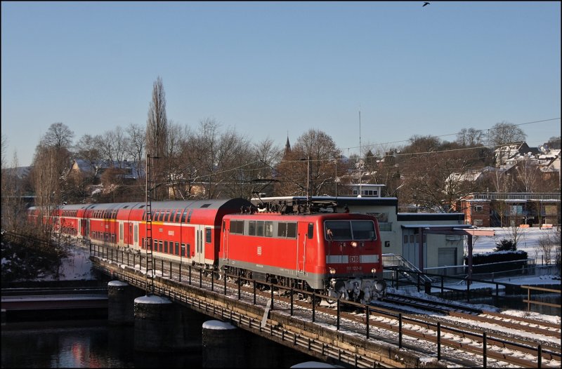 In der Mittagssonne des 06.01.2009 überquert die 111 122 (9180 6 111 122-8 D-DB) mit dem RE4 (RE 10420) "WUPPER-Express" am Haken den Harkortsee.