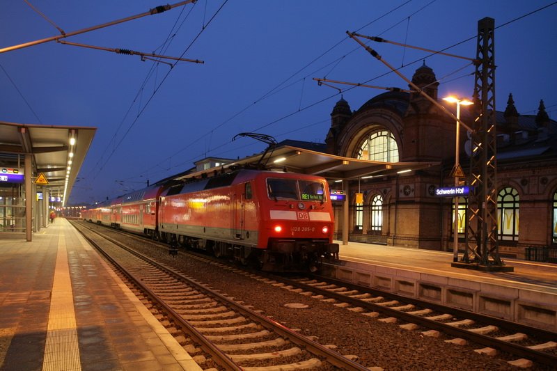 In Schwerin schiebt die 120 205-0 den RE1 nach Rostock. 16.01.2009
