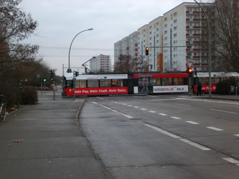 Berlin: Straßenbahnlinie M8 nach U-Bahnhof Schwarzkopfstraße an der Haltestelle Lichtenberg Bernhard-Bästlein-Straße.