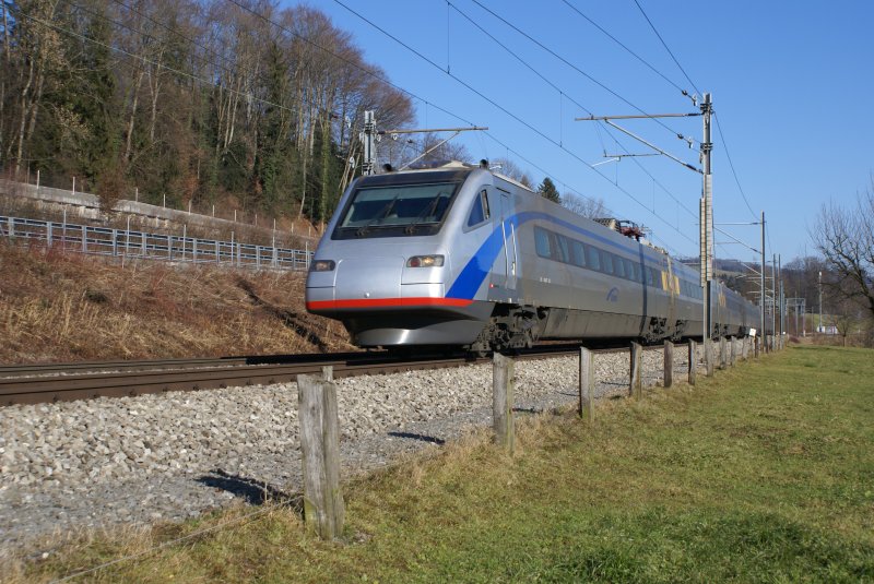 Zuletzt noch ein Bild des ETR 470 007, der sich eine Stunde später wieder auf den Weg Richtung Süden machte. Dieses Bild entstand ebenfalls am 25.1.09 in der Nähe von Baar.