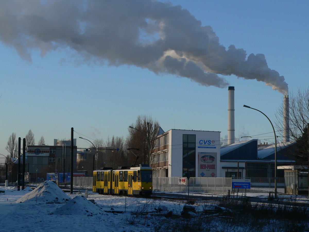 Eine Tram der Linie 21 auf dem Blockdammweg in Berlin Karlshorst. Im Hintergrund das Kraftwerk Klingenberg. 2.1.2009