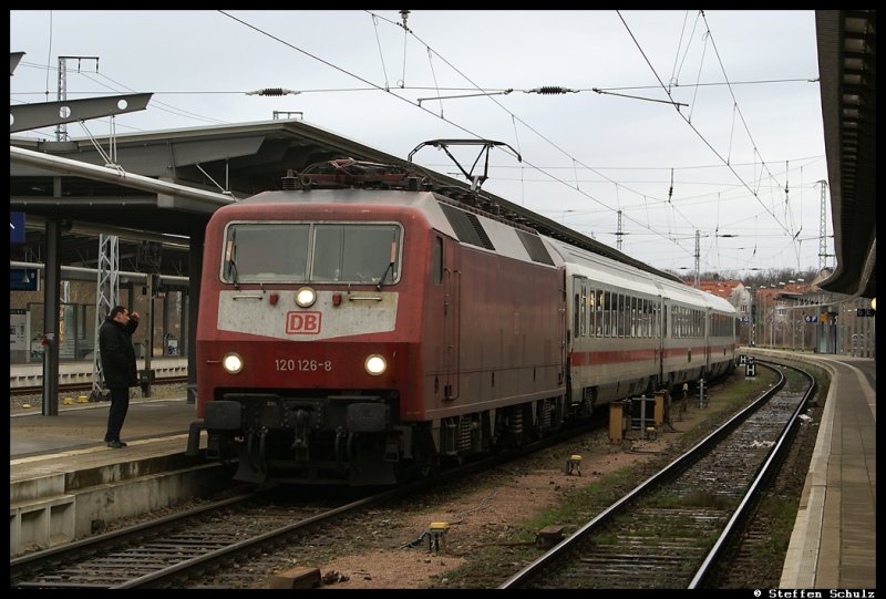 120 126 vor einem IC nach Köln. Aufgenommen am 04.01.09 im Rostocker Hbf