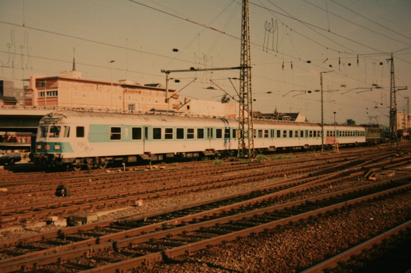 BR 120 mit Postwagen und Kinderlandwagen (2 letzter Wagen) Vorbahnhof von München Hbf, 1991