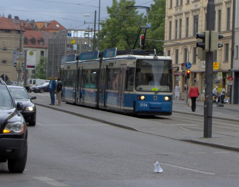 Ein Tram der Münchner Verkehrsbetriebe durchfährt die Innenstadt