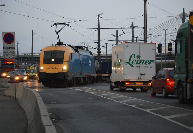 1116 280 "A1", dahinter Railjet 1116 200 und ein roter Ochse als 3fach Lokzug bei der Überfahrt des Wiener Handelskai (23.12.2008)