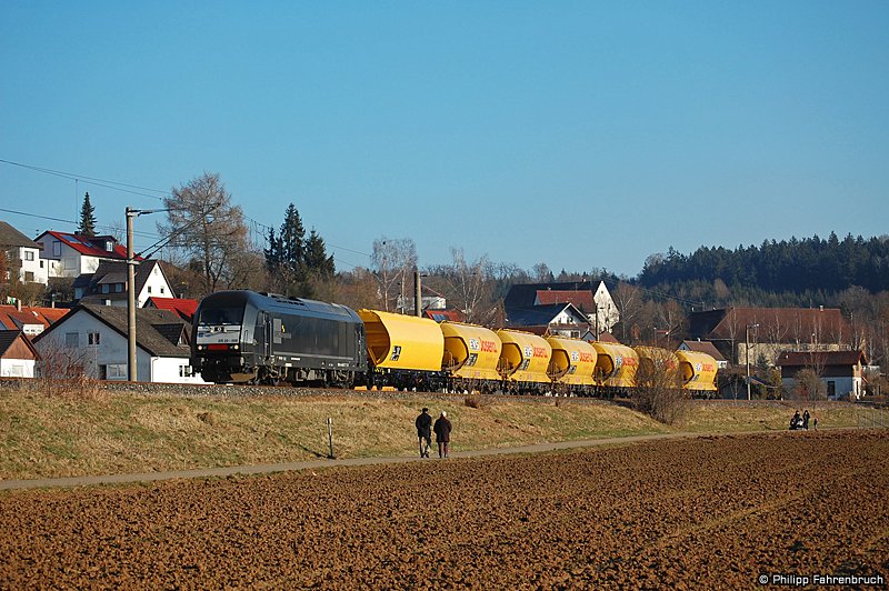 Auch eine Besonderheit der besonderen Art: Gleich zweimal hintereinander hing die Schweiz am IC 2082/83 "Königssee". Heute am Sonntag, den 4. Januar machte sie sich zum zweiten Mal auf den Weg in den schon teils verschneiten Norden. Aufnahme aus Gersthofen-Spielewelt.