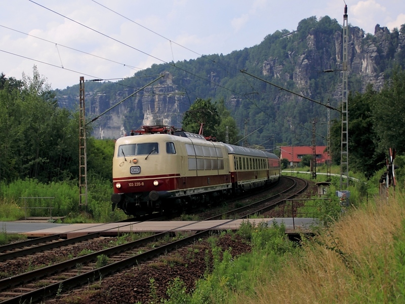 Ein Versuch von der 101 144, trotz widriger Umstände (Gegenlicht und Bahnsteig) ein ansprechendes Bild zu bekommen. Binz, den 24. Juni 2009