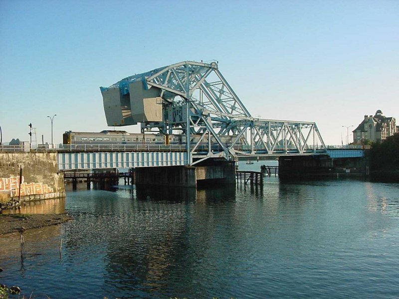 Der Malahat-Express hat die Station Victoria soeben verlassen und rattert über die gewaltige Hebebrücke in Richtung Courtenay, dem nördlichen Endpunkt der Bahnstrecke auf Victoria Island. 10.09.2001