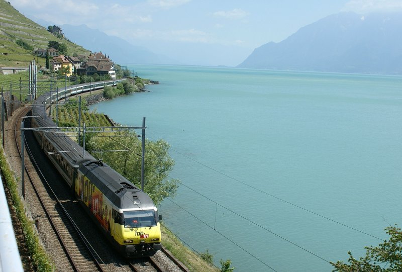 Die Bise(Ostwind)färbte den Lac Léman türkisgrün. Das veranlasste mich zu einem schnellen Fotostopp bei Epesses. Schade das nicht eine rote Re 460 sondern die Werbelok Login den langen Interregio nach Genf zog. (Mai 2009)