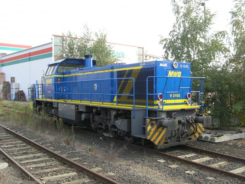 Die Mittelweserbahn hat einige Loks des Vossloh Typs G1206 im Einsatz. Am 11.10.2007 steht die V 2103 im Hildesheimer Güterbahnhof abgestellt.