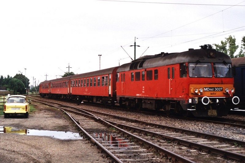 Ein trabi und eine MDmot 3027 auf Bahnhof Eger am 5-8-2005. Bild und scan: Date Jan de Vries.