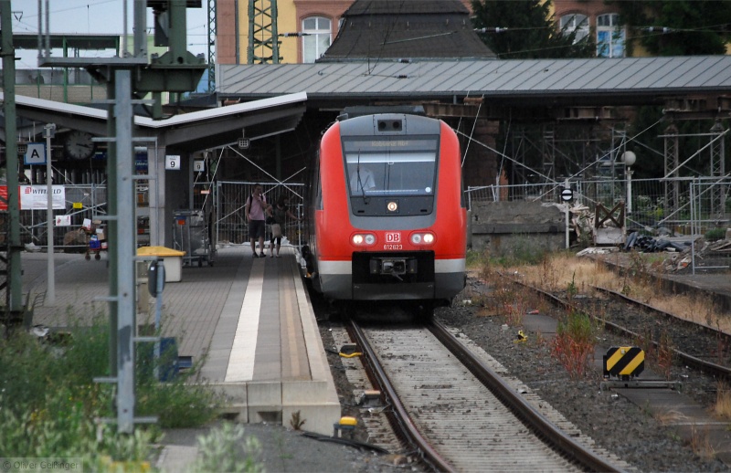 Grauer Betriebsalltag auf der Main-Weser-Bahn. Bei der Einfahrt in den Bahnhof Gießen denkt man erst an Dornröschen, wenn man an den beiden Rundlokschuppen vorbeifährt. Am Bahnhofsgebäude selbst ist seit zwei Jahren Umbau der Unterführung, sieht aber eher aus wie ein Kriegsgebiet. 612 623, hier an seinem Startpunkt, stellt den Anschluß über die Lahntalbahn Richtung Limburg/Koblenz dar. Elegant gelöst ist die Fahrplanverknüpfung, die RB aus Friedberg und (!) der Mittelhessenexpress aus Treysa/Marburg fahren eine Minute vor Abfahrt dieses Zuges ein. So lohnt ein Taktfahrplan, wenn man die Verbindung grundsätzlich knapp verpasst. Riesenlob an die Fahrplangestalter. So ist ein vernünfiger Anschluss von Norden und Süden nur mit einem IC-Fahrschein zu erreichen. (28. Juni 2009)