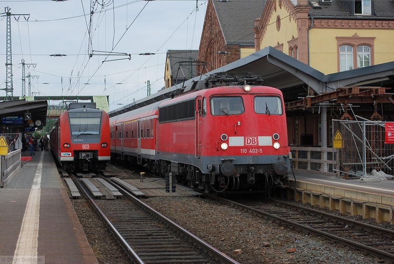 Grauer Betriebsalltag auf der Main-Weser-Bahn. Das Personal hat gewechselt, 110 402-5 fährt nach viertelstündiger Pause als RB 15341 zurück nach Friedberg. Links hält der Mittelhessenexpress alias Bandscheibenexpress, der hier Richtung Treysa und Dillenburg getrennt wird, sonntags fährt nur RE 25116 nach Dillenburg weiter und Fahrgäste Richtung Treysa müssen auf den überfüllten (I)RE Kassel warten. (28. Juni 2009)