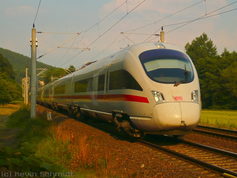 ICE 1602 aus München Hbf fährt in romantischer Abendstimmung die <a href= https://www.youtube.com/watch?v=DqaBPmjaGNA >Saalbahn</a> entlang, um nicht wie alle anderen ICEs nach Berlin zu fahren, sondern nach Dresden Hbf. Hier hat er bereits das Saalfelder Stadtgebiet verlassen. (30.06.2009)