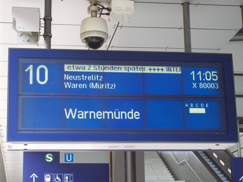 "Meine Damen und Herren am Gleis 10, bitte beachten Sie: Wegen einer Störung an dem Triebfahrzeug wird InterConnex 80003 nach Warnemünde über Neustrelitz, Abfahrt 11 Uhr 5, voraussichtlich mehr als 120 Minuten später eintreffen. Wir bitten um Entschuldigung!" :: Nachdem die wartenden Fahrgäste empört waren und der Kundenbetreuer den X 80003 telefonisch kontaktierte, waren an den 137 Minuten, die der Zug zum Aufnahmezeitpunkt um 11:52 verspätet war, wohl kaum noch etwas zu ändern.