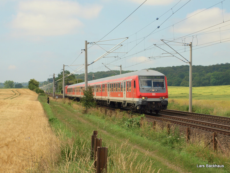 RE 21416 aus Hamburg Hbf wird am 29.06.09 außerplanmäßig von einer N-Wagen Garnitur gefahren, die warscheinlich als Ersatz einer ausgefallenen Dostogarnitur herhalten musste. Aufgenommen kurz vor Reinfeld (Holst.).