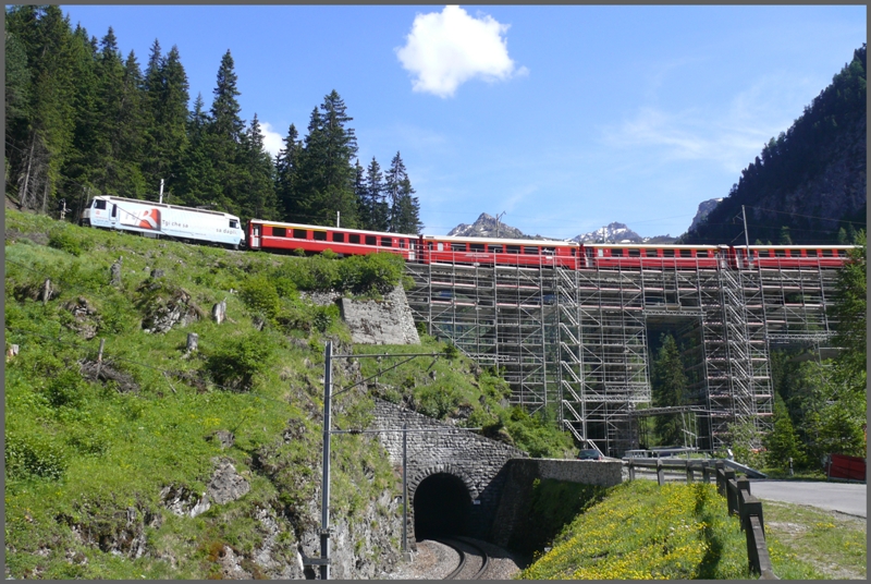 Wie der Landwasserviadukt wird auch diese Brücke beim zweiten Kehrtunnel oberhalb von Muot saniert. RE 1156 mit einer Ge 4/4 III befindet sich auf Talfahrt und wird in Kürze aus dem unteren Tunnelportal fahren. (18.06.2009)