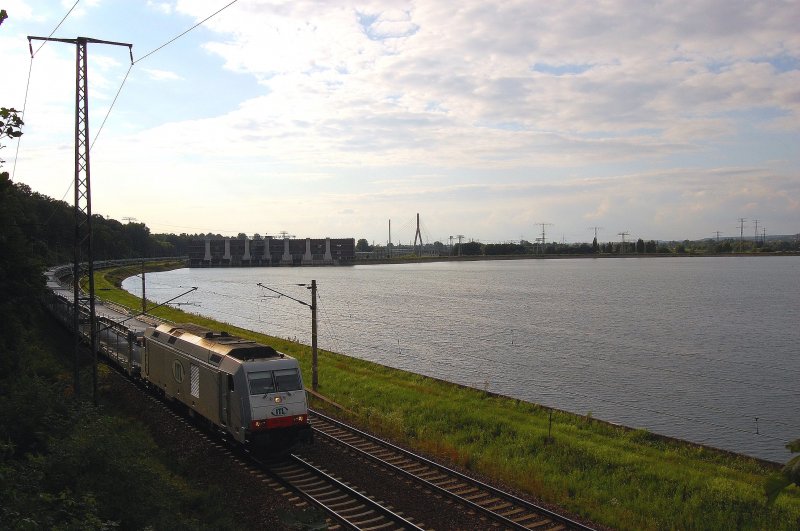 Am 09.07.2009 fährt 285 108 ??? am Stausee Niederwartha entlang Richtung Dresden-Friedrichstadt.Im Hintergrund ist das Pumpspeicherwerk Niederwartha zu sehen.