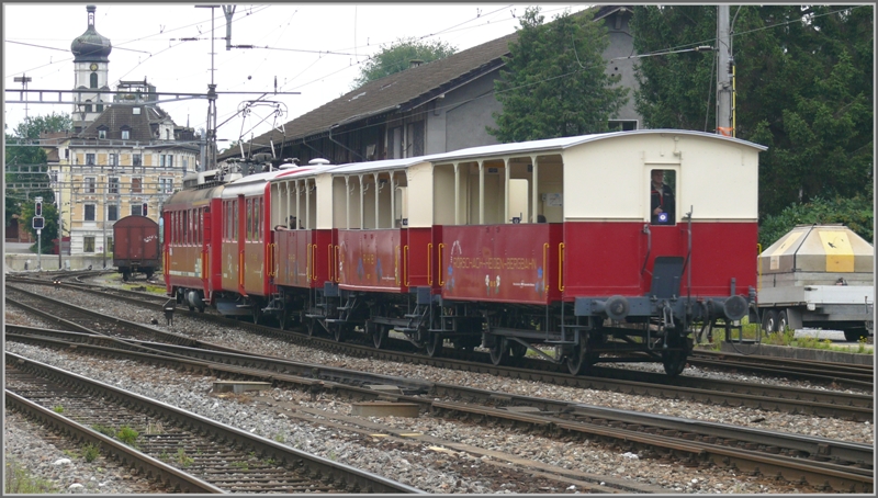 Bei der RHB hat man bestimmt frische Luft. ABDeh 2/4 23 auf der Rückfahrt nach Heiden zwischen Rorschach Hafen und Bahnhof. Die Wagen werden geschoben, somit ist es kein Nachschuss. (09.07.2009)