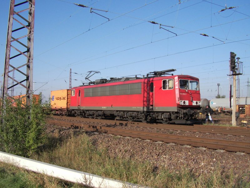 BR 155 055-7 ist gerade mit einem Containerzug vom Norden in Magdeburg - Rothensee Rbf angekommen. Rechts von der Lok sieht man den ablösenden Lokführer. (13.10.05)