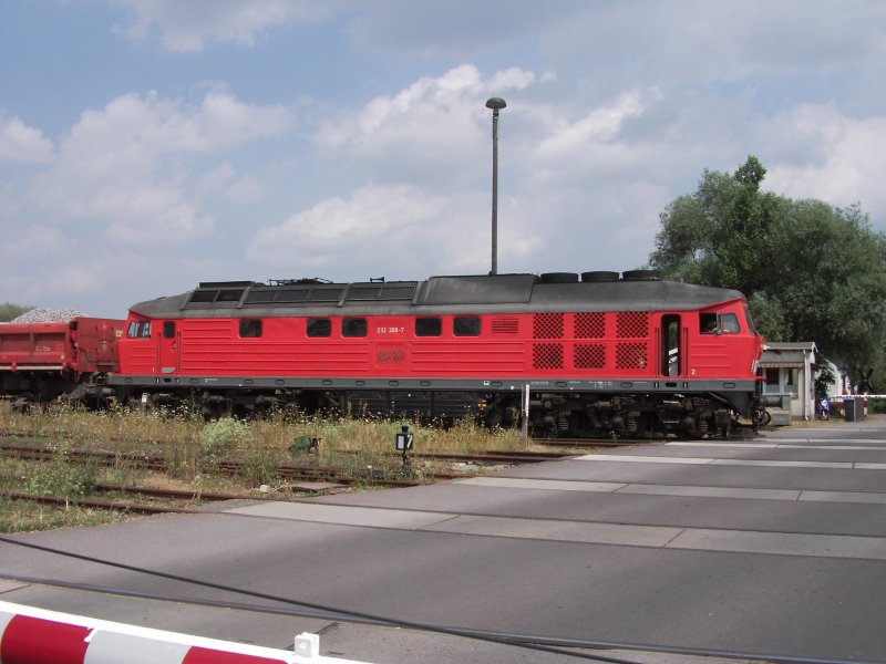 BR 232 308-7 fährt am 25.07.06 mit einem Schotterzug von Forsthaus Eiche in Haldensleben ein (links außerhalb des Bilds befindet sich das Bw Haldensleben und rechts die DB Tankstelle).