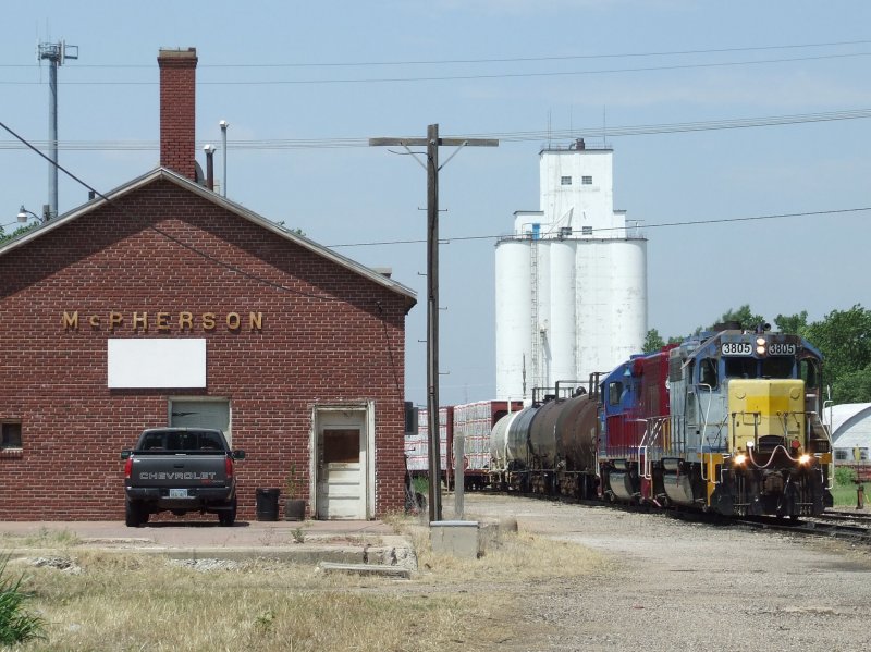 Der alte, nicht fuer Personenzuege intakte Bahnhof von Mc Pherson, Kansas am 09.07.2009