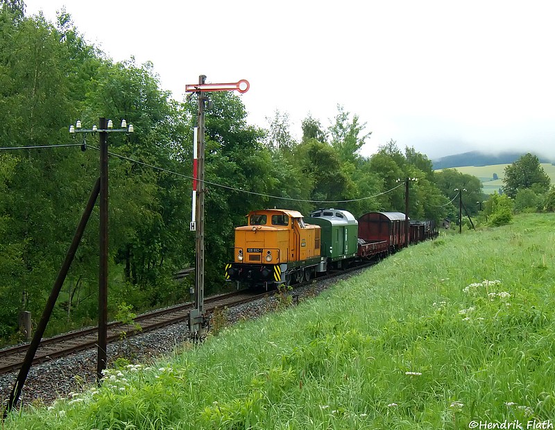 Die Aufnahmen die im Gewitterguss entstanden sind, erspare ich mir ;) Es geht weiter am Einfahrtsignal Grünstädtel. 106 992 ist mit DGS 91914 am 22.05.2009 auf dem Rückweg nach Schwarzenberg.
