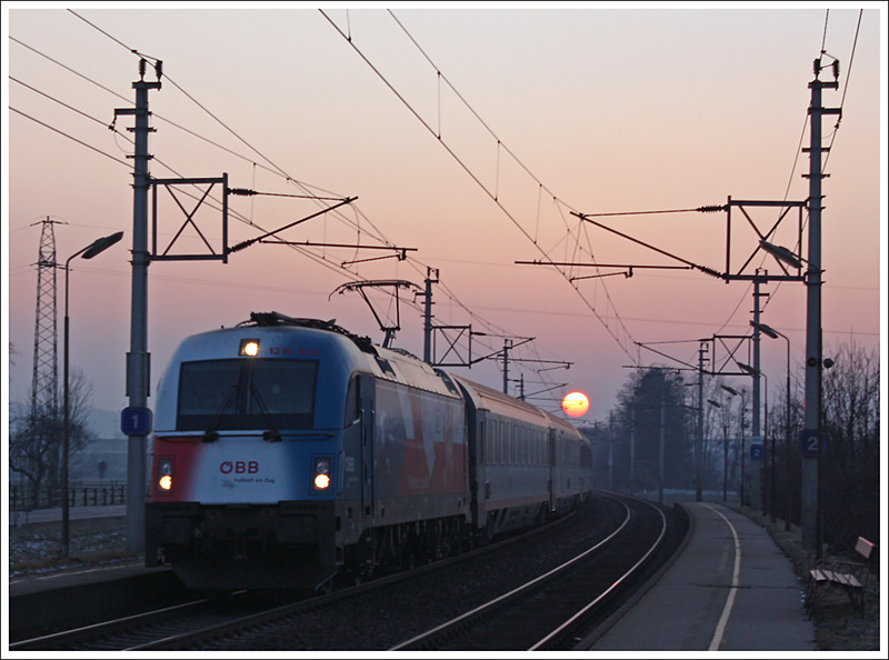 Ein schon bald historisches Bild, aufgenommen Anfang Jänner in Hubertendorf bei Ybbs/Donau. 1216 226 "Tschechien" mit dem OIC 643 gegen die schwache Sonne. 10.01.2009