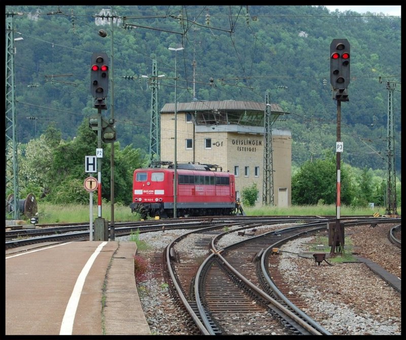 Eingerahmt zwischen zwei schon älteren Lichtsignalen, wartet die auch schon etwas in die Jahre gekommene 151 143-5 am 27.5.2009 in Geislingen auf den nächsten Güterzug, um eben diesem Schubhilfe zu gewähren.