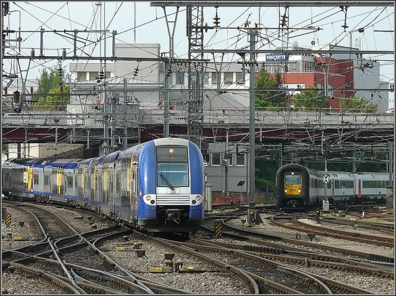 In Brig war am 02.07.2009 viel los. Während Re 460 084 mit ihrem IC in den Bahnhof einfährt, nimmt Re 4/4 165 mit einem Güterzug Anlauf für die Bergstracke über den Lötschberg