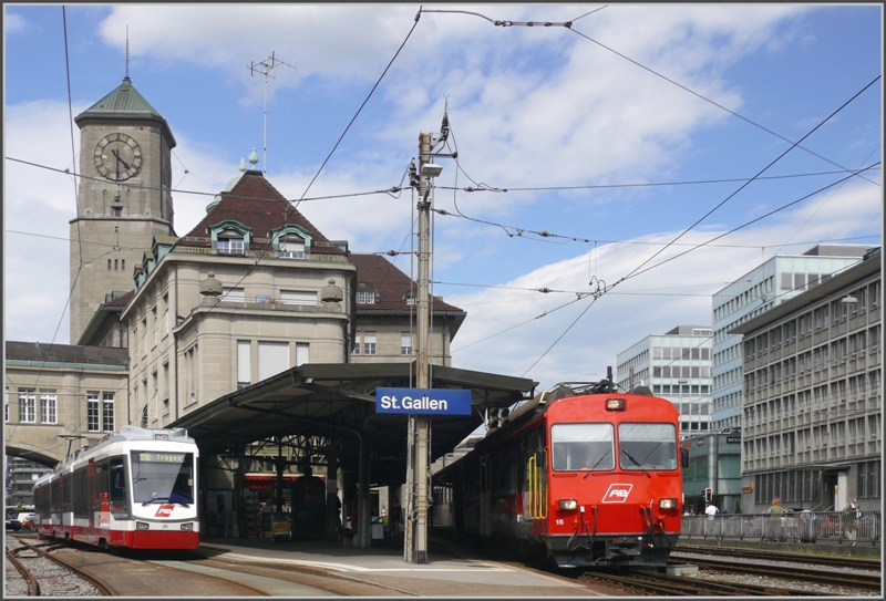 Im Nebenbahnhof St.Gallen vor dem imposanten Postgebäude warten Be 4/8 (TB) und BDeh 4/4 15 (SGA), jetzt beide Appenzeller Bahnen, auf die Abfahrtszeit. (09.07.2009)