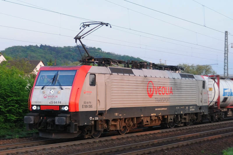 Mitzieher und Lokportrait auf "Veolia" E 189 095. (Auerbach, April 2009).