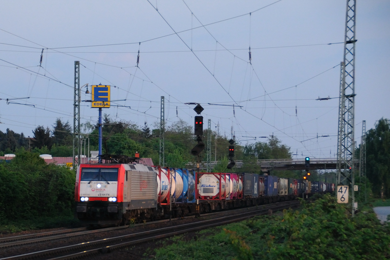 Schon von weitem am extra eingeschalteten Fernlicht erkennbar: E 189 095 der Veolia mit einem Klv-Ganzzug kurz vor Auerbach. (April 2009).