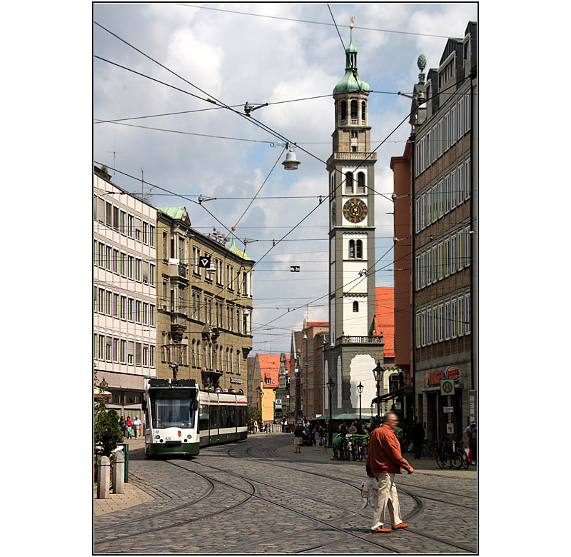 Die Straßenbahn im Stadtbild von Augsburg: Maximilianstraße mit Perlachturm. Im regulären Fahrgastbetrieb befindet sich nur die Strecke die hier nach links abzweigt.