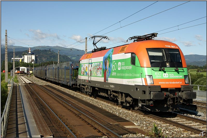 Werbetaurus 1116 007 "SOS-Kinderdorf" fährt mit 48114 von Tarvisio nach Strasshof.